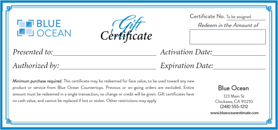Minimum purchase required. This certificate may be redeemed for face value, to be used toward any new product or service from Blue Ocean . Previous or on-going orders are excluded. Entire amount must be redeemed in a single transaction, no change or credit will be given. Gift certificates have no cash value, and cannot be replaced if lost or stolen. Other restrictions may apply